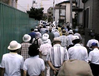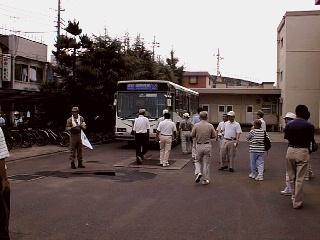 ![]() 自治会長などリーダーの誘導でバス駐車場に向かう最後の 避難誘導訓練。ご苦労様でした。 |