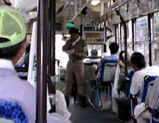 ![]() 会場の浦和競馬場へ向かうバスの中で訓練の説明をする 市役所の担当者の方 |