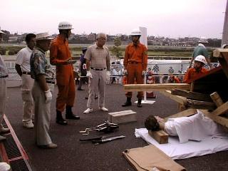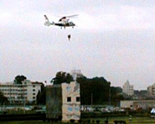 ![]() ヘリよりレスキュー隊の隊員がまずビル屋上にロープにより 投下され被災者に安全ベルトを装着して無事救出成功。 |