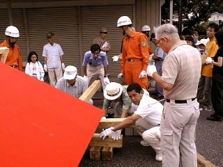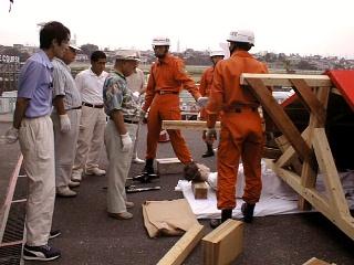 ![]() レスキュー隊の方から、大地震の時、地域の防災組織の協 力が重要なことや、バール、ジャッキなどの装備の有効性に ついて説明がありました。 |