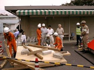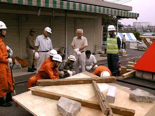 ![]() みんなで協力してまず崩れやすく、重たい物を取り除きまし た。二次倒壊を防ぐためです。 |